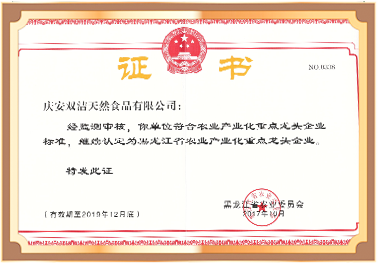 慶安雙潔天然食品有限公司認定為黑龍江省農業產業化重點龍頭企業